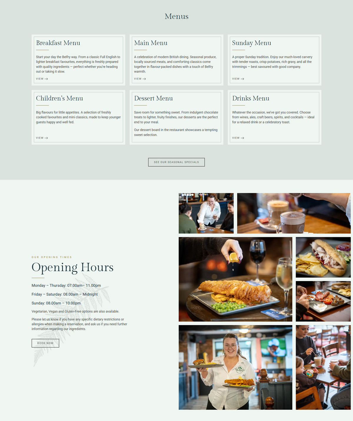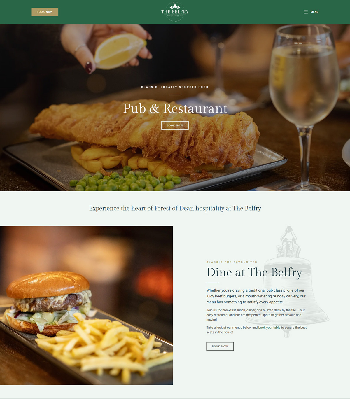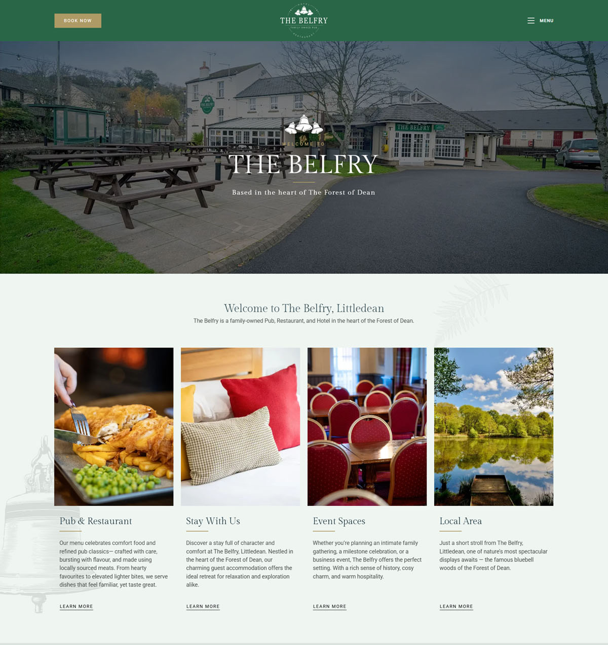 High-quality imagery is used throughout the site to showcase the hotel, pub and private hire rooms, helping visitors quickly understand what The Belfry has to offer. The design supports the visuals, creating an inviting and aspirational experience for potential guests.